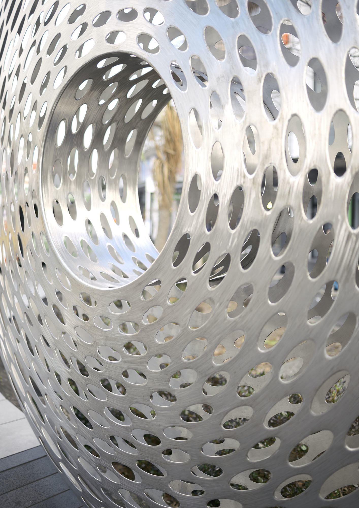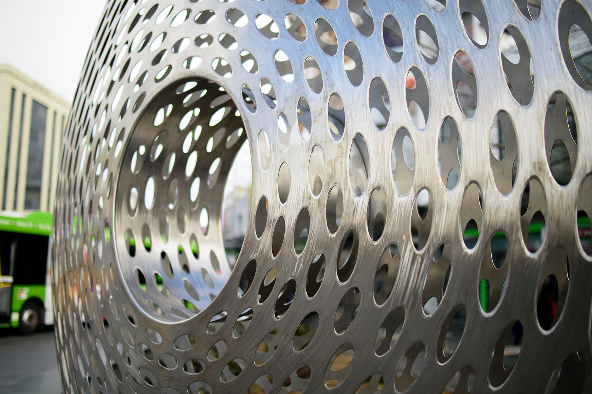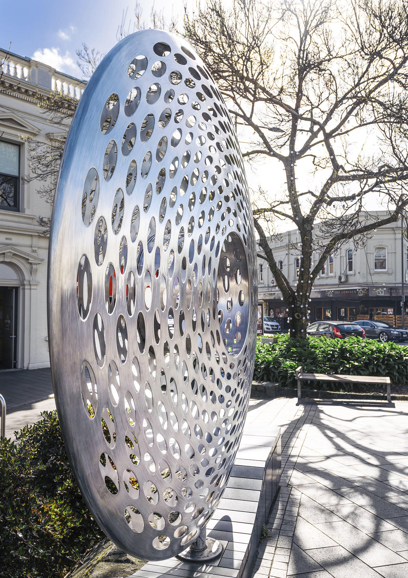 Large in size yet delicate in its detailing, this artwork adds visual interest to the busy retail corner of Khyber Pass and Broadway in Newmarket. The reflective stainless steel disc is marked with hundreds of elliptical spheres that both frame and reflect back the surroundings. In the centre of the sculpture is a circular opening which, according to sculptor Virginia King, plays on the concept of a lens.